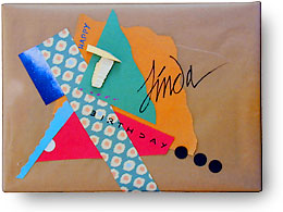 Brown Wrap Collage with Foam Stuffing This package contains a garlic press on its original display card. So I wrapped its lumpy form in a piece of 1" thick soft foam. That made it into a smooth object that was easy to wrap in brown paper. I finished it with wallpaper strips and 3 backyard berries. The writing is placed in a contrasting 90 degree position. |