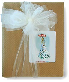 Brown Wrap/ Gauze Contrast This wrap relies on the contrast of rough brown industrial paper with white gauze ribbon. I had saved this ribbon with the bow intact: a wrap artist saves time by conserveing. The label was made with computer-label paper; the image was from our home-made Christmas card. |