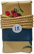 Fast Ribbon Wrap Two kinds of ribbon are wrapped around this gold-foil small package. First I taped a piece of blue ribbon on the back and wound it around many times till it was ready to tape again on the back. Then I did the same quick spiral technique using a piece of gold cord. I finished with a round office-supply sticker, to carry the intitals of the recipient. |