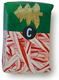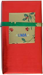 Folded Foil-Paper Ribbon & Label Foil paper folds easily. The resulting paper has a delightful embossed feel to it. I made a gold foil holly-paper label, writing the name with paint markers. After I glued it on the red foil wrap, I made a "ribbon" of green foil paper and taped it on the back. |